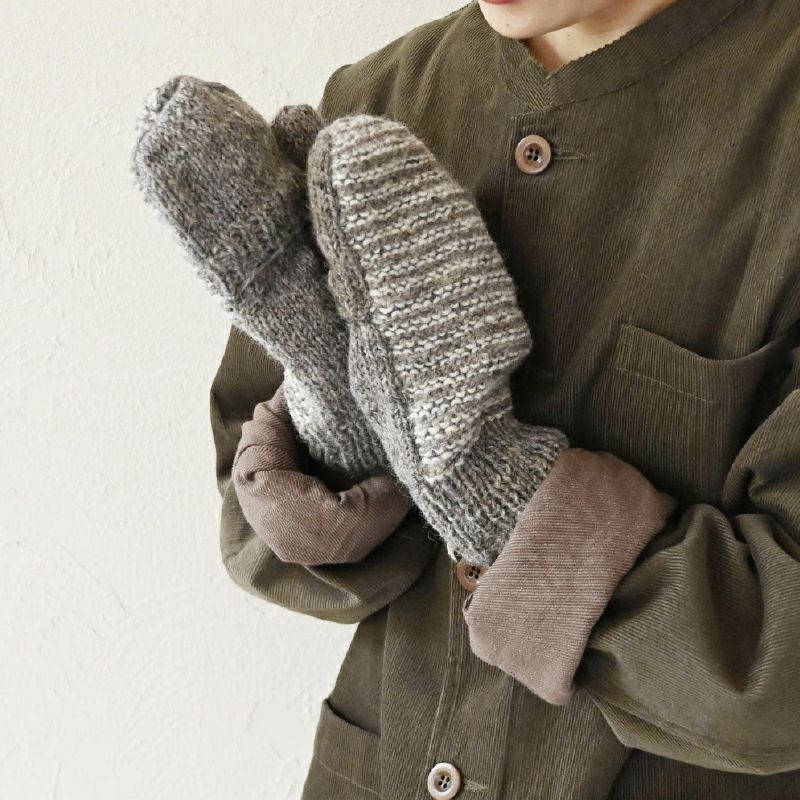 小さな「カケラ」を並べたイメージの可愛い編み模様。とっても温かいウール100%の手編みのミトンは、指先を使いたいときには、そのまま出せるように指カバー付き。裏地はコットン素材で優しい肌ざわり。