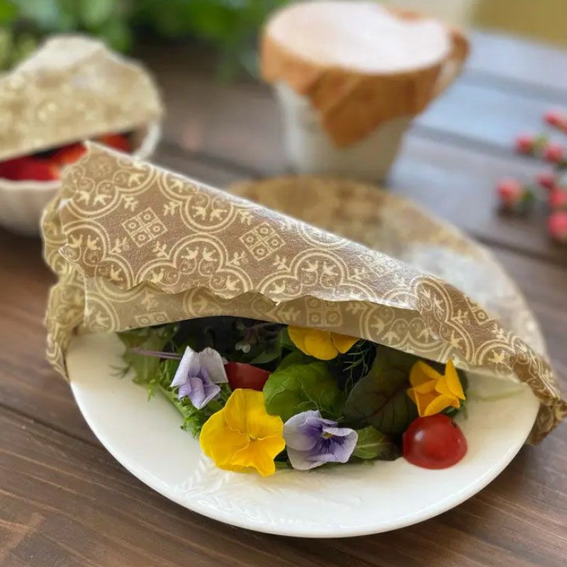 天然素材から作られたラップなので、程よい通気性、保湿性、そして蜜蝋の高い抗菌性により、包んだ食品の栄養素と鮮度の持ちを良くしてくれます。繰り返し使え使用後は土に還って堆肥になり、プラスチックゴミが出ない環境や健康に優しいエコなラップです。ひとつひとつ丁寧に手作業で作られています。